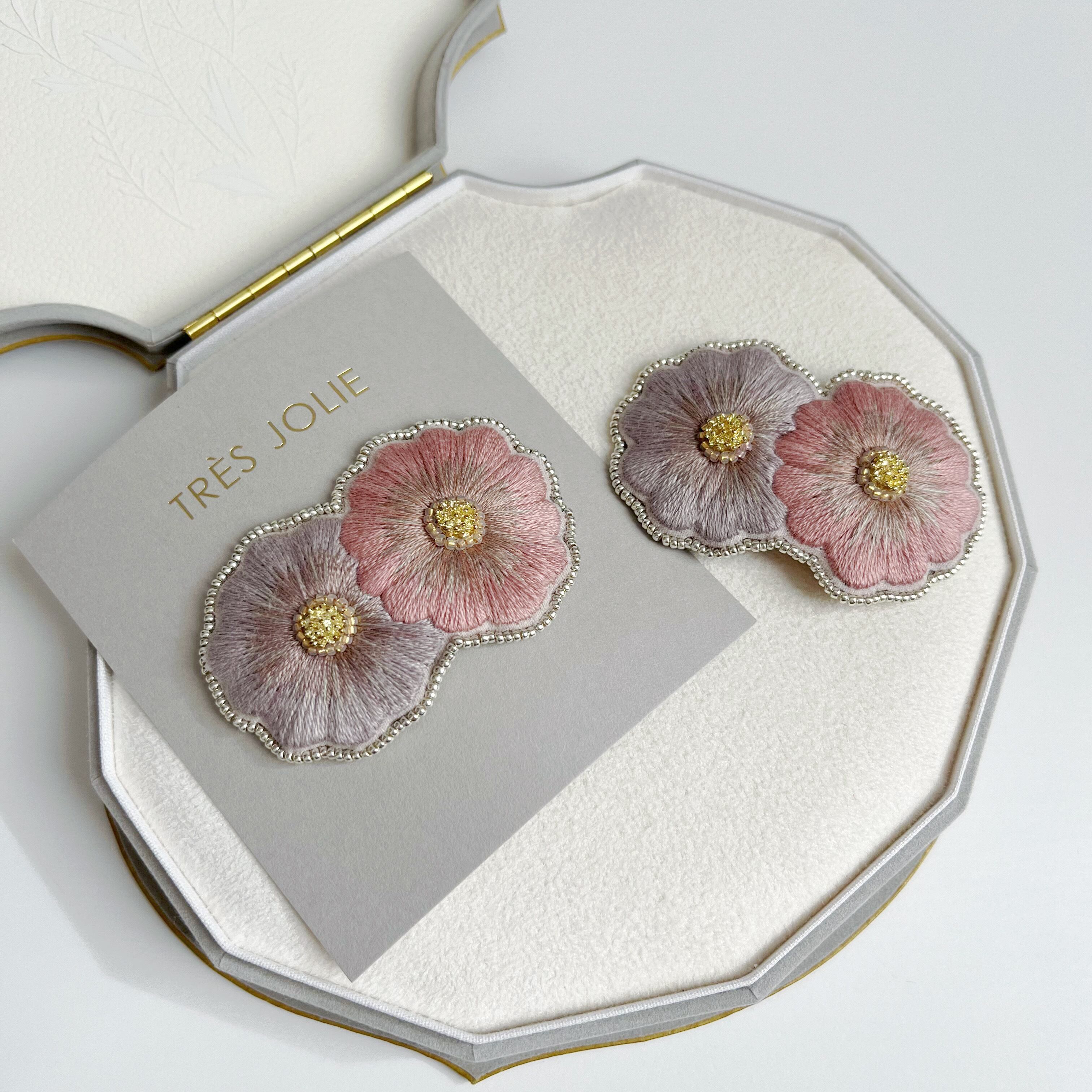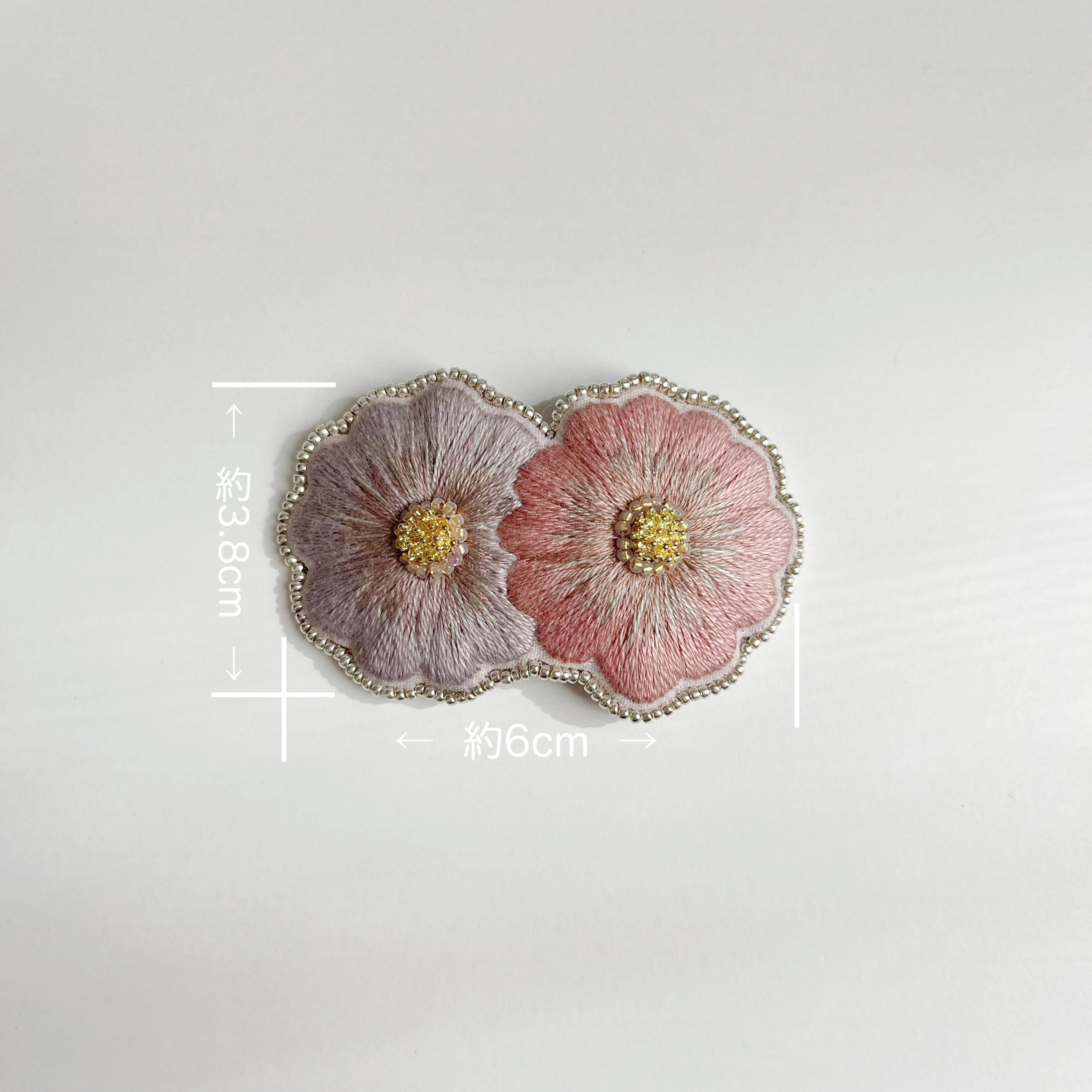 2つ重なったデザインの花刺繍、鮮やかながらも品のある佇まいを演出させながら日常使いできるデザインに落とし込み、ヘアピンに仕立てました。